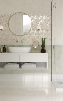 К дворцовой романтике XVIII века отсылает нас коллекция "Флора", с ее ониксовыми текстурами и растительным декором в пастельных тонах — шалфейном, розовом, бежевом. Специальная техника глянцевого покрытия заставляет плиты буквально светиться, а за счет применения особого материала — люминора — некоторые элементы декоративной вставки приобретают бархатный золотистый блеск. Чтобы полностью реализовать барочные мотивы, предусмотрены элементы с рельефом буазери, а точной вертикальной выкладке помогут настенный плинтус и бордюр.