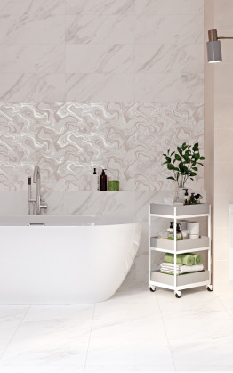Целая галактика текстур – вот, что такое коллекция Galaxy, соединившая в себе классический белый мрамор и трендовый эффект марморирования в пудровых розовых тонах. По-разному отражающие свет линии создают впечатление объема и легкости, а плиты с мозаичным геометрическим рельефом «провоцируют» оригинальную игру бликов на поверхности стен, которая подчеркивается цветной затиркой. Если актуальность решения кажется чрезмерной, его можно сделать более спокойным, используя лишь базовые плиты: дизайн не перестанет быть трендовым, но станет визуально мягче.